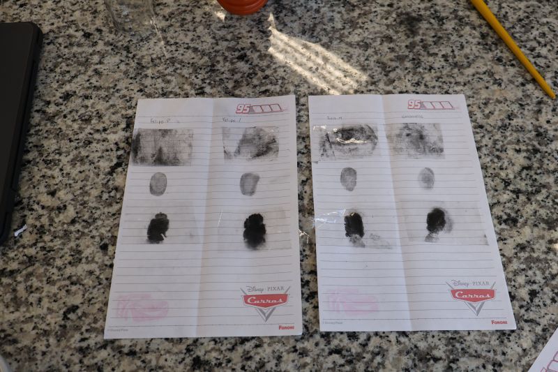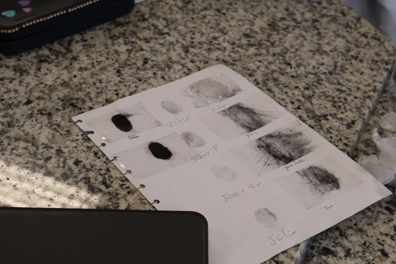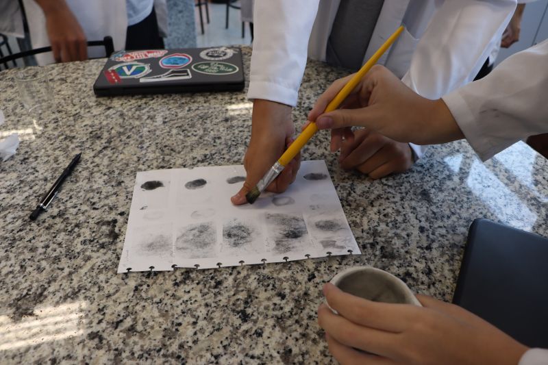 Para isso, com o auxílio da Juliana, responsável pelo espaço, reuniram-se em grupos e realizaram o experimento, pressionando o polegar no pó de carvão e depois em uma folha de sulfite, revelando então a impressão digital.
