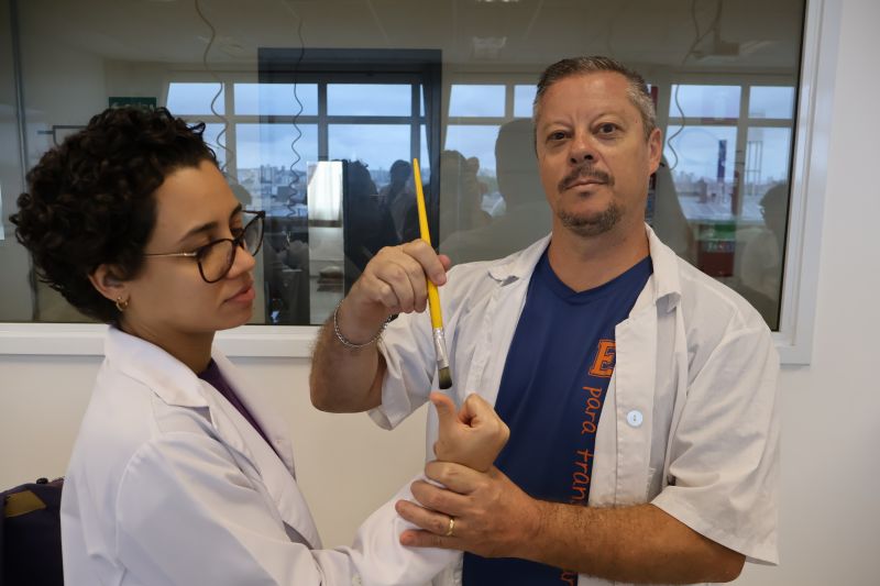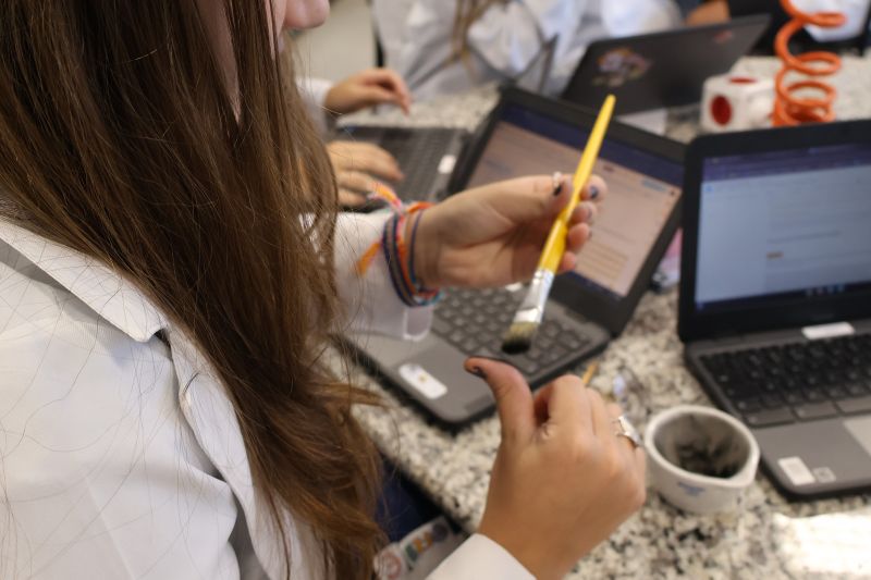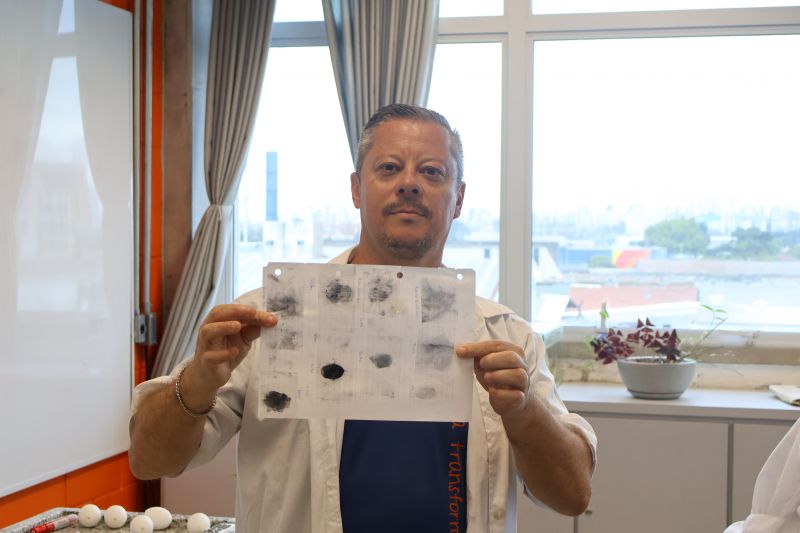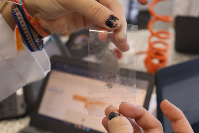Para finalizar, um dos integrantes transferiu sua impressão para um béquer de vidro, espalhando o pó com pincel para destacar os detalhes, permitindo a análise digital.