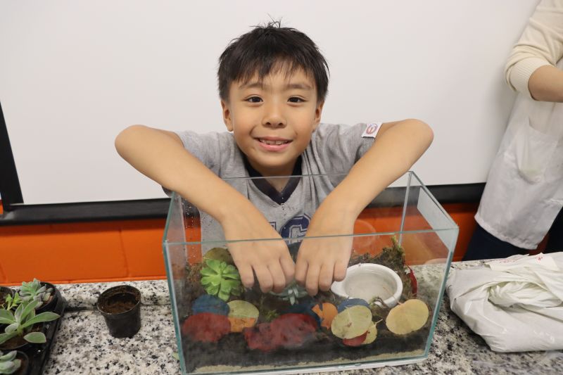 O objetivo da atividade foi compreender o conceito de terrário como um ambiente que imita o ecossistema natural, colocando em prática tudo o que aprenderam em sala de aula.