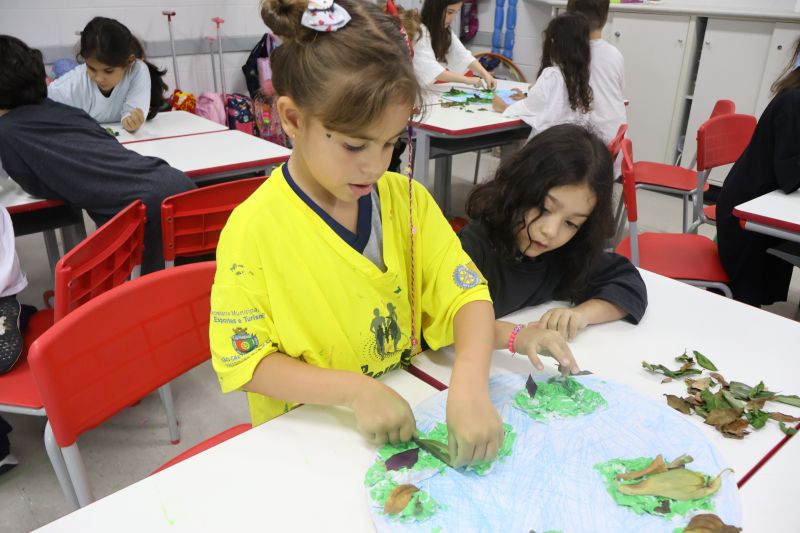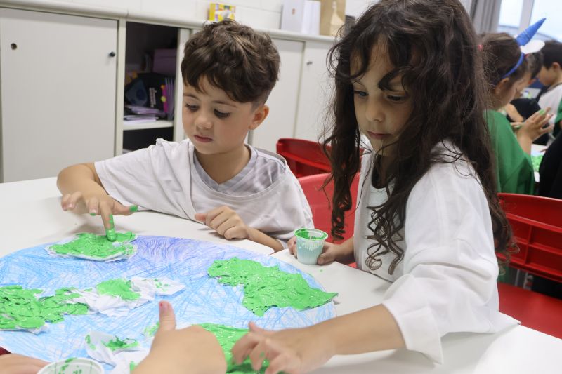 Em grupos, os pequenos confeccionaram o planeta Terra com diversos materiais, como tintas, folhas e papéis para simbolizar a terra, as árvores e a água.