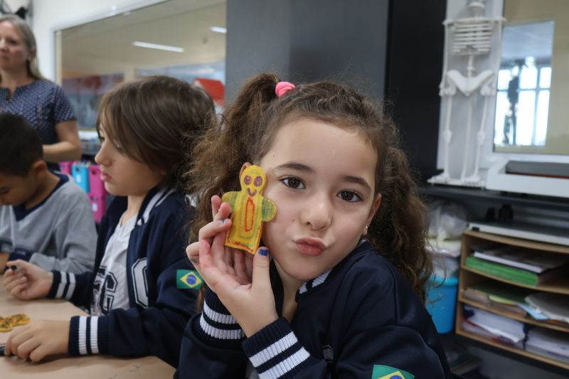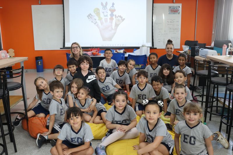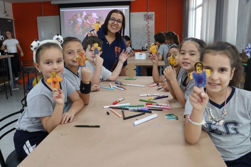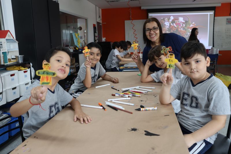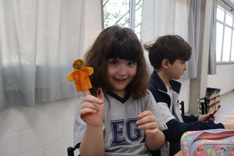 Inicialmente, os alunos observaram os diferentes brinquedos e conversaram sobre os materiais de que são feitos, como plástico, madeira, tecido e papel. Ao final, confeccionaram um dedoche e se divertiram.